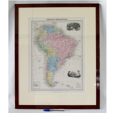 MAPA (40X31 CM) DA AMÉRICA DO SUL REPRESENTANDO A DIVISÃO GEOGRÁFICA, MOSTRANDO RIOS E ALGUMAS CIDADES PRINCIPAIS. POSSUI LEGENDA EM FRANCÊS E DOIS DESENHOS DA FLORESTA NATIVA. NA PARTE SUPERIOR, A INSCRIÇÃO 'AMÉRIQUE MÉRIDIONALE'. MOLDURA (56,5X45,5 CM) EM MADEIRA LAQUEADA, COM PASSE-PARTOUT NA COR BEGE.