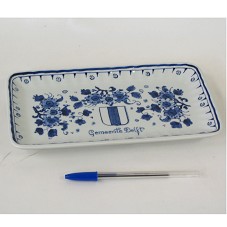 BANDEJA PEQUENA (24X14 CM) EM PORCELANA BRANCA, COM PINTURA EM TONS DE AZUL, DE MOTIVOS FLORAIS, COM UM BRASÃO NA PARTE CENTRAL E A INSCRIÇÃO 'GEMEENTE DELFT'. NA PARTE POSTERIOR, ALGUNS SÍMBOLOS. ACOMPANHA CARTÃO DO REMETENTE.