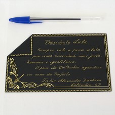 PLACA (10X16 CM) EM METAL PRETO, COM INSCRIÇÃO DOURADA. POSSUI UMA DAS PONTAS DOBRADA E A GRAVAÇÃO 'PRESIDENTE LULA / SEPRE VALE A PENA A LUTA POR UMA SOCIEDADE MAIS JUSTA, HUMANA E IGUALITÁRIA. O POVO DE COLÔMBIA AGRADECE EM NOME DO PREFEITO. FABIO ALEXANDRE BARBOSA / COLOMBIA - SP'. ACONDICIONADA EM ESTOJO FORRADO DE PRETO.