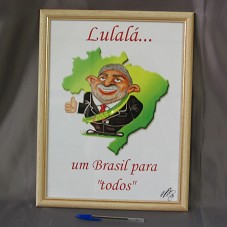 QUADRO (43X33,5 CM) COM MOLDURA EM MADEIRA PINTADA EM PÁTINA BEGE, COM FRISO DOURADO. EMOLDURA GRAVURA IMPRESSA, MOSTRANDO CARICATURA DO PRESIDENTE LULA VESTINDO A FAIXA PRESIDENCIAL COM OS DIZERES 'PT / PARA TODOS'; AO FUNDO, O MAPA DO BRASIL. POSSUI A INSCRIÇÃO 'LULALÁ... UM BRASIL PARA TODOS'. NO CANTO INFERIOR DIREITO, ASSINATURA DO ARTISTA 'PROF. TCHAI / 08'. ATRÁS, 'EU ESTIVE LÁ E FICO ORGULHOSO E FALO COM ORGULHO AOS MEUS ALUNOS QUE TIVE UM GRANDE LÍDER POLÍTICO CHAMADO LULA / ABRAÇOS DO PROFESSOR MARCO TCHAI'.