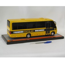 AUTOMODELO DE UM ÔNIBUS ESCOLAR (11,5X34X9,5 CM) NA COR AMARELO, COM DETALHES EM PRETO. NAS LATERAIS DELE, ADESIVOS COM NOMES DE MINISTÉRIOS FEDERAIS E 'PLANO DE DESENVOLVIMENTO DA EDUCAÇÃO / PROGRAMA CAMINHOS DA ESCOLA / FABUS / FNDE / BNDES'. FIXADO EM BASE DE MADEIRA COM PLACA EM METAL ONDE HÁ ADESIVO COM A INSCRIÇÃO 'MARCOPOLO / SENIOR / MARÇO 2008'.