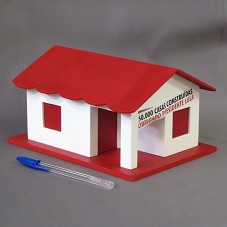 MAQUETE / MINIATURA DE CASA (11,5X13X18 CM), CONFECCIONADA EM MADEIRA. PINTADA DE BRANCO, COM BASE, JANELAS, PORTA E TELHADO EM VERMELHO. NA FRENTE, FAIXA EM PAPEL COM A INSCRIÇÃO '50.000 CASAS CONSTRUÍDAS / OBRIGADO PRESIDENTE LULA'.