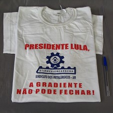 CAMISETA (TAM G) EM MALHA BRANCA, DE MANGA CURTA. NA FRENTE, ESTAMPA COM A INSCRIÇÃO 'PRESIDENTE LULA / A GRADIENTE NÃO PODE FECHAR / SINDICATO DOS METALÚRGICOS - AM' E LOGOMARCA DO SINDICATO.