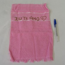 TOALHA DE MÃO (24X38 CM) NA COR ROSA. POSSUI A INSCRIÇÃO 'EU TE AMO' E UM CORAÇÃO COM A LETRA 'L' PINTADOS EM ALTO RELEVO.
