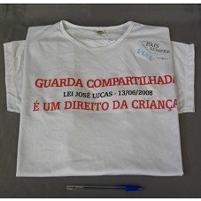CAMISETA (TAM GG) EM MALHA BRANCA, DE MANGA CURTA. NA FRENTE, ESTAMPA COM A INSCRIÇÃO 'GUARDA COMPARTILHADA / LEI JOSÉ LUCAS - 13/06/2008 / É UM DIREITO DA CRIANÇA' E 'MOVIMENTO PAIS PARA SEMPRE'.