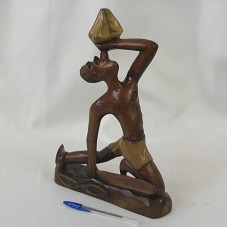 ESCULTURA (35,5X6X4 CM) CONFECCIONADA EM MADEIRA, REPRESENTANDO UM HOMEM AGACHADO, BEBENDO A ÁGUA DO COCO, SEGURANDO UM FACÃO NA OUTRA MÃO. EM UM DOS TORNOZELOS, CORDA QUE O AJUDA A SUBIR NO COQUEIRO.