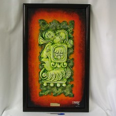 QUADRO (86X53 CM) COM MOLDURA EM MADEIRA ESCURA. EMOLDURA TELA TEXTURIZADA EM TONS DE VERMELHO E MARROM, TENDO, AO CENTRO, ESCULTURA BIDIMENSIONAL FIXADA. ESCULTURA TALHADA EM MADEIRA E PINTADA EM TONS DE BRANCO E VERDE. FIGURA ICONOGRÁFICA REPRESENTANDO UM PERFIL/ROSTO HUMANO. NO CANTO INFERIOR DIREITO, ASSINATURA DO ARTISTA 'J. SANABRIA 08 / HONDURAS, C.A.'. POSSUI PLAQUETA METÁLICA COM A INSCRIÇÃO 'REPUBLICA DE HONDURAS / MANUEL ZELAYA ROSALES / PRESIDENTE CONSTITUCIONAL'. NO REVERSO, CARIMBO COM INFORMAÇÕES SOBRE A PEÇA.