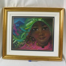QUADRO (65,5x75,5 CM) COM MOLDURA EM MADEIRA DOURADA. EMOLDURA GRAVURA (39,5X50,5 CM) COM ROSTO DE UMA MENINA E UNS PÁSSAROS COLORIDOS AO SEU LADO. PREDOMINA TONS DE VERDE, AZUL, ROSA E MARROM. NO CANTO INFERIOR ESQUERDO, ASSINATURA DO ARTISTA 'J. RAMIREZ' (NÃO ESTÁ COMPLETAMENTE LEGÍVEL). POSSUI TAMPO DE VIDRO.