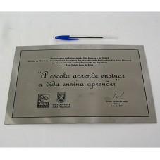 PLACA (20X30 CM) EM METAL PRATEADO, CONTENDO A INSCRIÇÃO 'HOMENAGEM DA UNIVERSIDADE SÃO MARCOS E DA UNAS / ... / AO EXCELENTÍSSIMO SENHOR PRESIDENTE DA REPÚBLICA LUIZ INÁCIO LULA DA SILVA / A ESCOLA APRENDE ENSINAR A VIDA ENSINA APRENDER / ERNANI BICUDO DE PAULA / REITOR / MAIO DE 2008'. ACONDICIONADA EM ESTOJO FORRADO DE VELUDO PRETO.