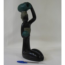 ESCULTURA (30,5 CM) CONFECCIONADA EM PEDRA-SABÃO, REPRESENTANDO UMA MULHER SENTADA SOBRE AS PERNAS, SEGURANDO UM VASO VERDE NA CABEÇA, E OUTRO NO BRAÇO DIREITO. NO FUNDO DA PEÇA, NOME DO ARTISTA 'R. GILLIS'. MULHER PINTADA DE PRETO, TENDO OS CABELOS E FAIXA NOS SEIOS NA COR DA PEDRA.