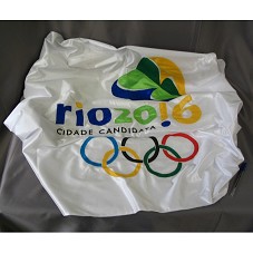 BANDEIRA (85X135 CM) DUPLA FACE, EM TECIDO BRANCO. POSSUI INSCRIÇÃO, EM AZUL, VERDE E AMARELO, 'RIO 2016'; EM PRETO, 'CIDADE CANDIDATA'. ABAIXO, AS CINCO ARGOLAS, SÍMBOLO DAS OLIMPÍADAS. NA PARTE SUPERIOR, LOGOMARCA EM ALUSÃO A UM CORAÇÃO, NAS CORES DA BANDEIRA BRASILEIRA. POSSUI EM UMA DAS LATERAIS, ILHOSES PARA FIXAÇÃO EM BASTÃO.