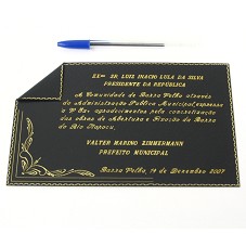 PLACA (14X22 CM) EM METAL PRETO, POSSUINDO UMA DAS PONTAS DOBRADA. EM DOURADO, A GRAVAÇÃO 'EXMO. SR. LUIZ INÁCIO LULA DA SILVA / PRESIDENTE DA REPÚBLICA / A COMUNIDADE DE BARRA VELHA ATRAVÉS DA ADMINISTRAÇÃO PÚBLICA MUNICIPAL, EXPRESSA À V. EXA. AGRADECIMENTOS PELA CONCRETIZAÇÃO DAS OBRAS DE ABERTURA E FRAÇÃO DA BARRA DO RIO ITAPOCU. VALTER MARINO ZIMMERMANN / PREFEITO MUNICIPAL / BARRA VELHA, 14 DE DEZEMBRO DE 2007'. ACONDICIONADA EM ESTOJO FORRADO DE LYCRA PRETA.