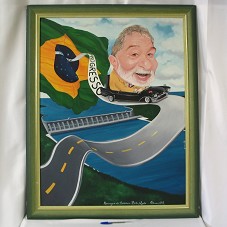 PINTURA (89X68 CM) SOBRE TELA, RETRATANDO CARICATURA DO PRESIDENTE LULA DIRIGINDO CARRO PRESIDENCIAL CONVERSÍVEL, SOBRE A FAIXA 'ORDEM E PROGRESSO' QUE SAI DA BANDEIRA BRASILEIRA, TRANSFORMANDO-SE EM UMA ESTRADA. AO FUNDO, BARRAGEM DE HIDRELÉTRICA. NA PARTE INFERIOR, A INSCRIÇÃO 'HOMENAGEM DO CONSÓRCIO BELO MONTE - ALTAMIRA-PA'. NA LATERAL DIREITA, ASSINATURA DO ARTISTA 'CATALÍCIO'. POSSUI MOLDURA (102X81 CM) EM MADEIRA PINTADA DE VERDE, COM FRISO DOURADO. NO REVERSO, A INSCRIÇÃO 'CARICATURA EM ÓLEO SOBRE TELA POR CATALÍCIO ANDRADE / 02-ABRIL- 2008 / E-MAIL: [email protected] / ...'.