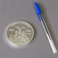 MEDALHA (65 MM) CONFECCIONADA EM PRATA. NO ANVERSO, A INSCRIÇÃO 'CÁMARA DE DIPUTADOS / 2006 2009' E FIGURA DE DUAS MULHERES SENTADAS DE COSTAS UMA PARA A OUTRA, VESTIDAS EM ESTILO ROMANO ANTIGO, E NO CENTRO, UM PEDESTAL COM UMA ÁGUIA. NO REVERSO, UM FALCÃO COM UMA COBRA PRESA AO BICO, E A INSCRIÇÃO 'ESTADOS UNIDOS MEXICANOS'. DESENHO CIRCUNDADO PELA GRAVAÇÃO 'CÁMARA DE DIPUTADOS / OM / LX LEGISLATURA'. MEDALHA POLIDA COM DESENHOS FOSQUEADOS. ACONDICIONADA EM ESTOJO ACRÍLICO E ESTE EM ESTOJO FORRADO DE VELUDO VINHO.