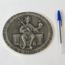 MEDALHA (14,5 CM) CONFECCIONADA EM PRATA. NO ANVERSO, FIGURA MOSTRANDO A COROAÇÃO DO PRIMEIRO REI LITUANO, NA EUROPA MEDIEVAL, 'MINDAUGAS', CIRCULADA PELA INSCRIÇÃO 'MYNDOUWE DEI GRA REX LITOWIE'. NO REVERSO, MOSTRA O REI AJOELHADO NO PRIMEIRO TEMPLO CRISTÃO LITUANO CONSTRUÍDO POR ELE, TENDO NA PARTE SUPERIOR UM ANJO ENTREGANDO A COROA E O CETRO REAL. FIGURA CIRCUNDADA POR FRAGMENTO DO TEXTO DE SEUS PRIVILÉGIOS. ACONDICIONADA EM ESTOJO FORRADO DE COURO BRANCO, COM MEDALHÃO NA TAMPA. NA PARTE INTERNA DA TAMPA, PEQUENA PLACA METÁLICA OFERTANDO O PRESENTE AO PRESIDENTE LULA.