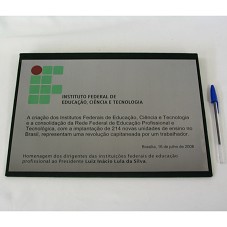 PLACA (20X30 CM) EM METAL PRATEADO, FIXADA EM BASE FORRADA DE VELUDO VERDE. POSSUI A INSCRIÇÃO 'INSTITUTO FEDERAL DE EDUCAÇÃO, CIÊNCIA E TECNOLOGIA / A CRIAÇÃO DOS INSTITUTOS FEDERAIS DE EDUCAÇÃO, CIÊNCIA E TECNOLOGIA E A CONSOLIDAÇÃO DA REDE FEDERAL DE EDUCAÇÃO PROFISSIONAL E TECNOLÓGICA, COM A IMPLANTAÇÃO DE 214 NOVAS UNIDADES DE ENSINO NO BRASIL, REPRESENTAM UMA REVOLUÇÃO CAPITANEADA POR UM TRABALHADOR. BRASÍLIA, 16 DE JULHO DE 2008. HOMENAGEM DOS DIRIGENTES DAS INSTITUIÇÕES FEDERAIS DE EDUCAÇÃO PROFISSIONAL AO PRESIDENTE LUIZ INÁCIO LULA DA SILVA.'. ACONDICIONADA EM ESTOJO FORRADO DE VELUDO VERDE ESCURO.