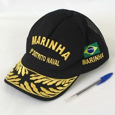 BONÉ EM TECIDO PRETO, COM TELA NA PARTE POSTERIOR. NA FRENTE, BORDADO EM AMARELO, 'MARINHA / 9º DISTRITO NAVAL'. NAS LATERAIS, BANDEIRA BRASILEIRA E BRASÃO DO NONO DISTRITO. POSSUI ABA BORDADA EM AMARELO.