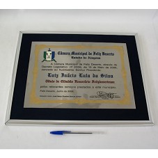 TÍTULO DE CIDADÃO HONORÁRIO FELIZDESERTENSE. PLACA EM AÇO ESCOVADO (23,5X31 CM) CONTENDO A INSCRIÇÃO 'A CÂMARA MUNICIPAL DE FELIZ DESERTO, ATRAVÉS DO DECRETO LEGISLATIVO Nº 20/06, DE 15 DE MAIO DE 2006, CONCEDE AO ILUSTRÍSSIMO SENHOR PRESIDENTE / LUIZ INÁCIO LULA DA SILVA / TÍTULO DE CIDADÃO HONORÁRIO FELIZDESERTENSE / PELOS RELEVANTES SERVIÇOS PRESTADOS A ESTE MUNICÍPIO. FELIZ DESERTO, JUNHO DE 2006. VEREADOR AUTOR: JOSÉ HARRY GUEDES SANTOS JÚNIOR / PRESIDENTE'. POSSUI BRASÃO DO MUNICÍPIO. FIXADA EM QUADRO (33X40,5 CM) COM MOLDURA DE ALUMÍNIO E PASSE-PARTOUT EM VELUDO AZUL MARINHO.