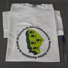 CAMISETA (TAM GG ) EM MALHA BRANCA, DE MANGA CURTA. NA FRENTE, ESTAMPA EM TONS DE VERDE, MOSTRANDO O MAPA DO CEARÁ, COM A INSCRIÇÃO 'REDE DE CATADORES(AS) DE RESÍDUOS SÓLIDOS RECICLÁVEIS DO ESTADO DO CEARÁ'.