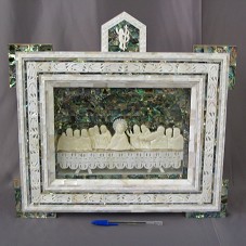QUADRO DE MESA (34X42 CM), TIPO CAIXA, COM TAMPO DE VIDRO E MOLDURA EM MOSAICO. EMOLDURA COMPOSIÇÃO BIDIMENSIONAL QUE REPRESENTA A SANTA CEIA. ACOMPANHA CARTÃO DE VISITA DO AGENTE. ACONDICIONADO EM CAIXA FORRADA DE VELUDO VINHO.