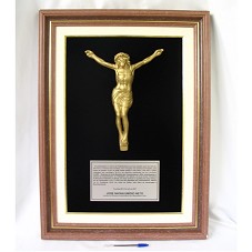 QUADRO (76X56 CM) EMOLDURANDO ESCULTURA BIDIMENSIONAL DO CRISTO CRUCIFICADO (33X26X4 CM), FIXADA SOBRE FUNDO DE VELUDO PRETO. POSSUI PLACA METÁLICA COM A INSCRIÇÃO '... / O SUBC - ..., RECONHECENDO O ESFORÇO DO EXCELENTÍSSIMO SR. PRESIDENTE LUIZ INÁCIO LULA DA SILVA, ..., EM TENTAR DIMINUIR O SACRIFÍCIO DE NOSSA CLASSE, POR TER SANCIONADO A LEI Nº 11.442, QUE DEU DIGNIDADE AOS CAMINHONEIROS, OFERECE AO SR. PRESIDENTE LULA, EM NOME DA CLASSE, ESTA PLACA DE HOMENAGEM E RECONHECIMENTO. GUANHÃES-MG, 22 DE JULHO DE 2007 / JOSÉ NATAN EMÍDIO NETO / PRESIDENTE DO SINDICATO DA UNIÃO BRASILEIRA DOS CAMINHONEIROS E AFINS'.