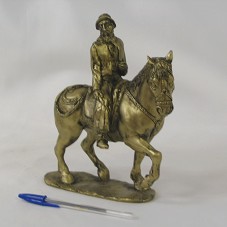 ESCULTURA (21,5X19X10 CM) CONFECCIONADA EM RESINA E PINTADA EM DOURADO, IMITANDO BRONZE. REPRESENTA UM HOMEM, COM VESTES TÍPICAS DA REGIÃO SUL, MONTADO EM SEU CAVALO.