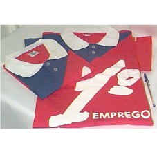 DUAS CAMISAS GOLA PÓLO (TAM M) DO PROJETO PRIMEIRO EMPREGO. CAMISAS NA COR VERMELHA, COM UMA FAIXA NA DIAGONAL EM AZUL, PEGANDO UMA DAS MANGAS. NA FRENTE A INSCRIÇÃO '1º EMPREGO'; ATRÁS, 'GOVERNO DO MARANHÃO / TEMPO DE NOVAS CONQUISTAS', COM FAIXAS EM VERMELHO E PRETO E UMA ESTRELA AZUL; NA MANGA ESQUERDA ' GDS / GERÊNCIA DE DESENVOLVIMENTO SOCIAL'. GOLA PÓLO NA COR BRANCA E DOIS BOTÕES PERTO DA GOLA. ACONDICIONADAS EM SACO PLÁSTICO.