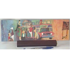 PINTURA (35X11 CM) EM PEDAÇO DE MADEIRA. MOSTRA UM ÔNIBUS, COM LATERAL ABERTA, EM MOVIMENTO, COM VÁRIOS PASSAGEIROS DENTRO, ALGUMAS PESSOAS NA RUA E O INÍCIO DE UMA CASA. TEM TONS DE AZUL, VERDE, AMARELO, VERMELHO. ASSINADO PELA AUTORA, NA PARTE INFERIOR DIREITA 'DI'. QUADRO DE MESA, ACOMPANHA SUPORTE (20X7X1,8 CM) PARA COLOCAÇÃO, EM MADEIRA ESCURA COM ASPECTO AVELUDADO. ACONDICIONADO EM CAIXA (37,5X14X5 CM) DA MESMA MADEIRA, COM TAMPA ABERTA FAZENDO UMA MOLDURA NA PINTURA. ACOMPANHA CARTÃO DA REMETENTE, COM A INSCRIÇÃO MANUSCRITA 'EDITH CECILIA URVEGO HERRERA / GERENTE GENERAL / EMPRESAS PÚBLICAS DE MEDELLIN / CORDIAL SALUDO'. NO FUNDO DA CAIXA, UM CARTÃO COM DESENHO DE UMA BONECA DE PANO E 'TALLER DE ILUSIONES / 315 2686528 / MÔNICA RAMÍREZ / 3130161'. E, NA TAMPA DA CAIXA, UMA PEQUENA PLACA (2X3 CM) COM A INSCRIÇÃO 'EEPP DE MEDELLIN'.