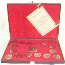 CAIXA (41,5 X 57 X 7 CM) CONTENDO DEZESSEIS MEDALHAS (7 X 0,5 CM) E UMA PLAQUETA (8,5 X10,5 0,5 CM) EM 'BRONZE PATINÉ'. RETRATAM 'MOMENTOS ESTELARES DE LA VIDA DE BOLIVAR / MEDALLAS CONMEMORATIVAS DEL BICENTENARIO DE SU NACIMIENTO / 1783 - 1983 / MONNAIE DE PARIS'. A PLAQUETA TRAZ AO FUNDO UM 'B' COLORIDO, BANDEIRAS E BRASÕES, DESENHO DE UM HOMEM MONTADO A CAVALO COM OUTROS AO SEU REDOR, E A INSCRIÇÃO 'LA EPOPEA DE SIMON BOLIVAR EL LIBERTADOR'. CADA MEDALHA TRAZ UM DESENHO E INSCRIÇÃO REFERENTE AO MESMO, SOBRE A VIDA DE BOLIVAR. ACOMPANHA CERTIFICADO DE AUTENTICIDADE ASSINADO POR 'L'ADMINISTRATEUR CIVIL, CHEF DU SERVICE DES MÉDAILLES, F. BUTERI', EM PAPEL TIPO PERGAMINHO, COM LETRAS EM VERMELHO. A CAIXA É EM MADEIRA,COM REVESTIMENTO EXTERNO EM COURO MARROM E, INTERNO EM VELUDO VERMELHO. POSSUI NA TAMPA A INSCRIÇÃO 'BOLIVAR' EM DOURADO, UMA FITA COM AS CORES AMARELO, AZUL E VERMELHO, FAZENDO TRÊS FAIXAS E UM CARTÃO DO REMETENTE 'HUGO CHÁVES FRÍAS / PRESIDENTE DE LA REPÚBLICA BOLIVARIANA DE VENEZUELA'. EM UMA DAS LATERAIS 'COLECCIONES NUMERADAS, EN BRONCE DEL Nº 1 AL Nº 250, ESTA COLECCIÓN ES LA Nº 193'.
