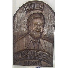 TALHA EM MADEIRA (42,5X66,5X2,5 CM) COM A PARTE SUPERIOR EM ARCO. TRAZ NA FRENTE O BUSTO DO PRESIDENTE LUIZ INÁCIO LULA DA SILVA ENTALHADO E A INSCRIÇÃO 'LULA / O PRESIDENTE O BRASIL'. A FRENTE DA MADEIRA ESTÁ ESCURECIDA. ATRÁS, A INSCRIÇÃO 'WALACE N. BARBOSA / LEMBRANÇA = VALÉRIA / PARINTINS - AM'.