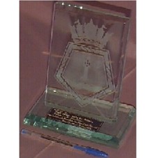 PLACA EM VIDRO (12X17,5X2 CM), LATERAIS BISOTADAS, COM O SÍMBOLO DO NAVIO PATRULHA FLUVIAL PEDRO TEIXEIRA DESENHADO A JATO DE AREIA POR TRÁS DELA. COMPOSTO POR UM PENTÁGONO INVERTIDO, COM ONDAS E UM NAVIO NA FACE FRONTAL DENTRO DELE; EM CIMA, VELAS DE NAVIOS COM BANDEIRAS. PLACA COLADA EM BASE DE VIDRO (16X9X2 CM) BISOTADA, COM INSCRIÇÃO GRAVADA 'N P F PEDRO TEIXEIRA'. CONTÉM UMA PLACA (3X9 CM) EM METAL PRETO, GRAVADA EM DOURADO 'AO EXMO. SR. LUIZ INÁCIO LULA DA SILVA, PRESIDENTE DA REPÚBLICA, UMA LEMBRANÇA DO NAVIO PATRULHA FLUVIAL 'PEDRO TEIXEIRA' / PARINTINS, AM, EM 29/JUN/2003'.