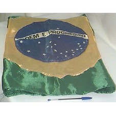 BANDEIRA DO BRASIL (90X68 CM) EM CETIM, COM CADA UMA DAS PARTES COSTURADAS POR CIMA DA OUTRA. CÍRCULO AZUL EM DUAS FACES (FRENTE E TRÁS).