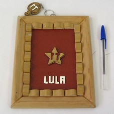 QUADRO (20,5X15,5 CM) CONFECCIONADO EM MADEIRA, COM MOLDURA TRABALHADA EM MESMO MATERIAL. EMOLDURA PEQUENA ESTRELA DE MADEIRA, QUE POSSUI AS LETRAS 'PT' NO CENTRO, SOBRE POSSUI FUNDO PINTADO EM TOM DE MARROM AVERMELHADO. NA PARTE INFERIOR, A INSCRIÇÃO 'LULA', EM BRANCO. ACOMPANHA CHAVEIRO NO FORMATO DE UM CAJU, COM A INSCRIÇÃO 'PT'.