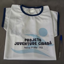 CAMISETA (TA G) EM MALHA BRANCA, COM DETALHES AZUL E MANGAS CURTAS. NA FRENTE, ESTAMPA COM A INSCRIÇÃO 'PROJETO JUVENTUDE CIDADÃ / NOVA PRATA-RS'. ATRÁS, 'PROJETO JUVENTUDE CIDADÃ / MINISTÉRIO DO TRABALHO E EMPREGO / PROJOVEM / ESTADO DO RIO GRANDE DO SUL / MUNICÍPIO DE NOVA PRATA'.