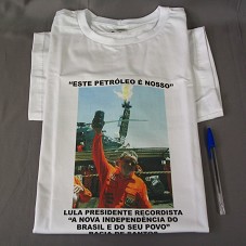 CAMISETA (TAM GG) EM MALHA BRANCA, DE MANGA CURTA. NA FRENTE, ESTAMPA COM FOTOGRAFIA DO PRESIDENTE LULA ERGUENDO AMOSTRA DE ÓLEO E VESTINDO UNIFORME DA PETROBRÁS. POSSUI A INSCRIÇÃO 'ESTE PETRÓLEO É NOSSO / LULA PRESIDENTE RECORDISTA / A NOVA INDEPENDÊNCIA DO BRASIL E DO SEU POVO / BACIA DE SANTOS / 02/09/08'. POSSUI ASSINATURA E TELEFONE DO AGENTE. ATRÁS, LOGOMARCA DA PETROBRÁS E 'O DESAFIO É A NOSSA ENERGIA, A ENERGIA QUE NASCE DO FUNDO DA ALMA'.