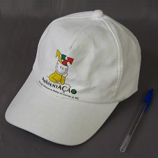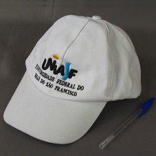 BONÉ EM TECIDO BRANCO. NA FRENTE, BORDADO EM PRETO, AZUL E AMARELO, A INSCRIÇÃO 'UNIVASF / UNIVERSIDADE FEDERAL DO VALE DO SÃO FRANCISCO'.