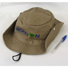 CHAPÉU, TIPO AUSTRALIANO, EM TECIDO MARROM. NA FRENTE, ESTAMPA, EM AZUL, 'PROJETO RONDON / LIÇÃO DE VIDA E DE CIDADANIA' E LOGOMARCA. ATRÁS, LOGOMARCAS DE INSTITUIÇÕES DE PATROCÍNIO.