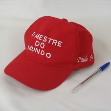 BONÉ EM TECIDO VERMELHO. NA FRENTE, BORDADO EM BRANCO, 'O MESTRE DO MUNDO'. NAS LATERAIS, 'PAULO FREIRE'.