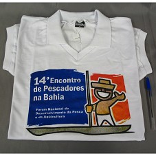 CAMISA (TAM G) GOLA PÓLO, EM MALHA BRANCA, DE MANGA CURTA. NA FRENTE, DESENHO ESTILIZADO, MOSTRANDO UM PESCADOR NA JANGADA, E A INSCRIÇÃO '14º ENCONTRO DE PESCADORES DA BAHIA / FÓRUM NACIONAL DE DESENVOLVIMENTO DA PESCA E DA AQUICULTURA'. ATRÁS, NOMES E LOGOMARCAS DAS INSTITUIÇÕES DE REALIZAÇÃO E APOIO.