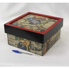 CAIXA (22,2X22,2X11,5 CM) DE MADEIRA, COM TAMPA. POSSUI O EXTERIOR REVESTIDO COM RECORTES DE JORNAIS, MOSTRANDO O PRESIDENTE LULA EM DIVERSAS OCASIÕES, E NOTÍCIAS DA COTRIMAIO. BORDA DA TAMPA PINTADA EM PRETO, COM DETALHE EM VERMELHO. NA PARTE INTERNA, ETIQUETA DO FABRICANTE, COM NOME DA ARTESÃ. ACOMPANHA PAPEL COM ENDEREÇO DE 'MARLISE MARIA FERNANDES'.