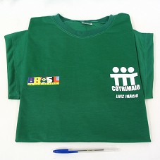 DUAS CAMISETAS IGUAIS (TAM G) EM MALHA VERDE, DE MANGA CURTA. POSSUEM LOGOMARCA DA 'COTRIMAIO' E DO GOVERNO FEDERAL 'BRASIL UM PAÍS DE TODOS'. ATRÁS, 'PROJETO DE DESENVOLVIMENTO E CAPACITAÇÃO DA MULHER AGRICULTORA PARA A GESTÃO DA PROPRIEDADE E O COOPERATIVISMO'. EM UMA DAS CAMISETAS, O NOME DO PRESIDENTE 'LUIZ INÁCIO'; NA OUTRA, 'MARISA'.