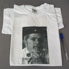 CAMISETA (TAM G) EM MALHA BRANCA, DE MANGA CURTA. NA FRENTE, ESTAMPA COM FOTOGRAFIA PRETA E BRANCA DO PRESIDENTE LULA USANDO UMA BOINA COM A ESTRELA DO 'PT', E A INSCRIÇÃO 'O REVOLUCIONÁRIO BRASILEIRO'. NA PARTE POSTERIOR, ESTAMPA COM A INSCRIÇÃO 'JUVENTUDE PT / MAUÁ / SOCIALISTA DEMOCRÁTICO E DE MASSAS'.
