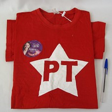 CAMISETA (TAM M) EM MALHA VERMELHA, DE MANGA CURTA. POSSUI ESTAMPA COM DESENHO DE ESTRELAS BRANCAS. ATRÁS, 'SÃO GONÇALO DO AMARANTE'. NA FRENTE, ETIQUETA COM PROPAGANDA POLÍTICA DA CANDIDATA DO PT À PREFEITURA, 'FÁTIMA'.