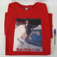 CAMISETA (TAM XXG) EM MALHA VERMELHA, DE MANGA CURTA. NA FRENTE, ESTAMPA COM FOTOGRAFIA COLORIDA MOSTRANDO O PRESIDENTE LULA DENTRO DE UM CARRO, COM A PORTA ABERTA. NA PORTA, UMA CRIANÇA E ALGUNS HOMENS. POSSUI A INSCRIÇÃO 'MAURO ROCHA E LULA'.