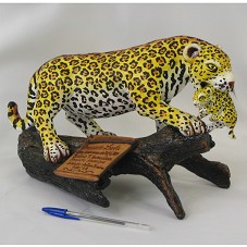 ESCULTURA (23X38X24 CM), EM RESINA EPÓXI, REPRESENTANDO UMA ONÇA PINTADA FIXADA SOBRE TRONCO DE MADEIRA, CARREGANDO UM FILHOTE PELA BOCA. NO TRONCO, PLACA EM MADEIRA COM A GRAVAÇÃO 'PRESIDENTE LULA / UMA LEMBRANÇA DE TEFÉ/AM / SIDÔNIO T. GONÇALVES / PREFEITO MUNICIPAL / ARTESÃO: ANTÔNIO SEABRA / AGO/08'.