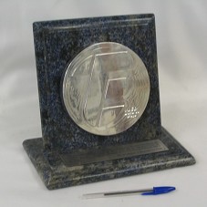 PLACA CIRCULAR (15,2X15,2X1,8 CM) EM METAL PRATEADO COM LOGOMARCA DO 'CEFET' EM ALTO RELEVO, E A INSCRIÇÃO 'UNED MARIA DA GRAÇA'. FIXADA EM PLACA DE MÁRMORE AZULADO (20,5X21,5 CM), E ESTA EM BASE DE MESMO MATERIAL, ONDE HÁ PLACA METÁLICA COM A INSCRIÇÃO 'HOMENAGEM DO CEFET/RJ AO EXCELENTÍSSIMO SENHOR PRESIDENTE DA REPÚBLICA, LUIZ INÁCIO LULA DA SILVA, PELO ATO DE TRANSFORMAÇÃO DO CAMPUS MARIA DA GRAÇA EM UNIDADE DE ENSINO DESCENTRALIZADA MARIA DA GRAÇA. RIO DE JANEIRO, 9 DE JUNHO DE 2006'.