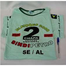 DUAS CAMISETAS IGUAIS (TAM XG) EM MALHA VERDE, DE MANGA CURTA. NA FRENTE, A INSCRIÇÃO 'ELEIÇÕES 2008 / FUP / CUT / CHAPA 2 UNIDADE NACIONAL / SINDIPETRO / SE/AL'. ATRÁS, 'CHAPA 2 / UNIDADE NACIONAL' E DESENHO ESTILIZADO DE UMA TORRE DE PETRÓLEO.