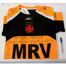 CAMISA DE TREINO DE FUTEBOL (TAM GG) DO TIME 'CLUBE DE REGATAS VASCO DA GAMA', NAS CORES LARANJA E PRETO. POSSUI BRASÃO DO TIME NA PARTE FRONTAL E A INSCRIÇÃO 'MRV'. COM DEDICATÓRIA 'AO ILMO. PRESIDENTE LUÍS INÁCIO LULA DA SILVA', ASSINATURA DO PRESIDENTE DO TIME E DE OUTRAS PESSOAS.