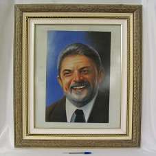 QUADRO (76X67 CM) COM MOLDURA CLARA COM DETALHES EM MARROM; PASSE PARTOUT BRANCO COM FRISO DOURADO, E TAMPO DE VIDRO. EMOLDURA DESENHO (48X33 CM) RETRATANDO O PRESIDENTE LULA SORRINDO, SOBRE FUNDO EM DEGRADÊ AZUL. NO CANTO INFERIOR ESQUERDO, ASSINATURA DO ARTISTA 'J. NEVES'. ACOMPANHA CARTÃO DE VISITA DO AGENTE.