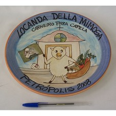 CONJUNTO DE DOIS PRATOS DECORATIVOS (2,5X26X26 CM), IGUAIS, CONFECCIONADOS EM CERÂMICA E PINTADOS À MÃO. POSSUEM FUNDO AZUL, COM BORDA EM TOM MAIS ESCURO DE AZUL, E, NO CENTRO, DESENHO DE UM CARNEIRO CARREGANDO UMA CESTA COM LEGUMES E SEGURANDO UMA BANDEIRA, TENDO, AO FUNDO, FACHADA DE UMA IGREJA. POSSUEM A INSCRIÇÃO 'LOCANDA DELLA MIMOSA / CARNEIRO PARA CAPELA / PETRÓPOLIS 2008'. ATRÁS, 'RESTAURANTE DA BOA LEMBRANÇA / HAND PAINTED / BRIC / [email protected]'. ACONDICIONADOS, SEPARADAMENTE, EM CAIXAS DE PAPELÃO BRANCO COM A INSCRIÇÃO 'PETYBOM / GRANO DURO / ASSOCIAÇÃO DOS RESTAURANTES DA BOA LEMBRANÇA'. ACOMPANHA FOLDER COM RELAÇÃO DOS RESTAURANTES ASSOCIADOS.